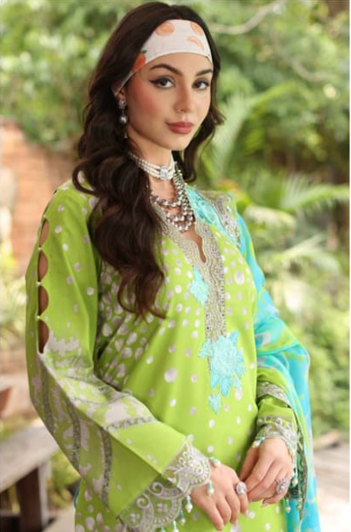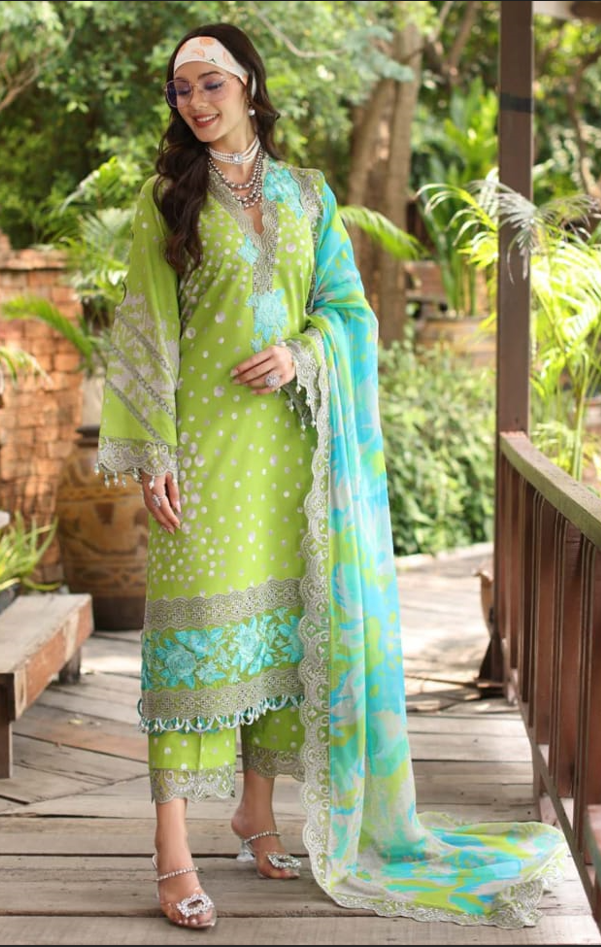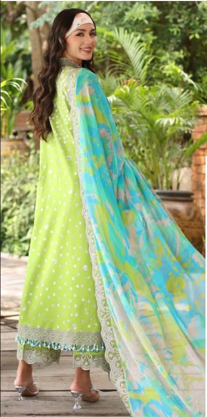 Step into the season with the vibrant energy of Design No. AN5-10 from the Aniq by Charizma Volume 2 luxury lawn collection. This ensemble perfectly captures the essence of a tropical summer, combining a bold lime green palette with intricate white embroidery and high-quality fabrics.