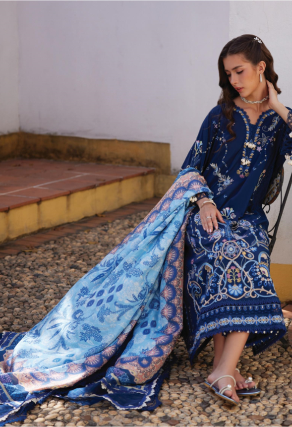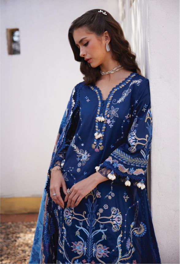 The Nia Navy is a sophisticated masterpiece that features a deep, regal ink-blue canvas paired with striking, multi-tonal floral embroidery. This elegant look is elevated by signature schiffli (eyelet) detailing and a vibrant silk dupatta in contrasting sunset tones, offering a perfect blend of mystery and modern grace for an evening affair.
