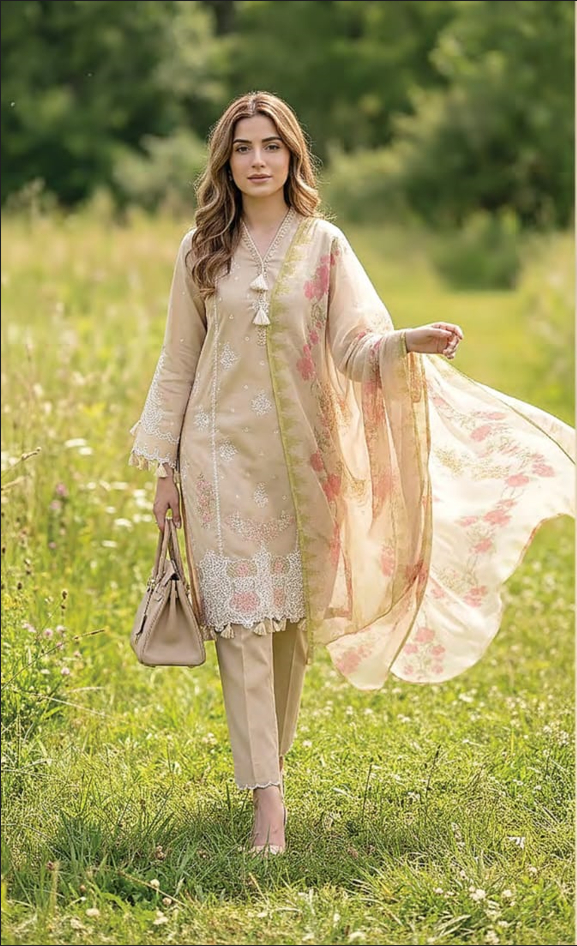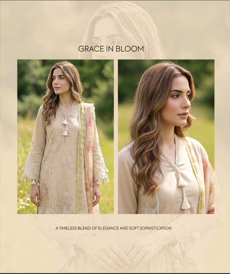 Grace in Bloom is a masterclass in neutral elegance, designed to provide a cooling visual aesthetic during the warmest summer days. As a highlight of the Lakhany 2026 collection, this unstitched 3-piece set focuses on a sophisticated sand beige hue, detailed with high-thread-count ivory embroidery that mimics the look of vintage lace.