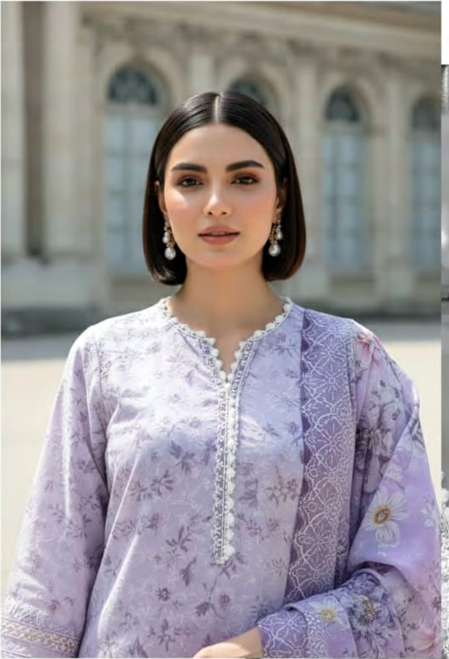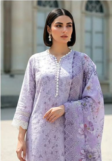 The ensemble is grounded by a coordinating printed lawn dupatta that mirrors the shirt’s floral garden motif, ensuring a cohesive and regal look for festive daytime events. Matched with dyed tonal lavender trousers, this 3-piece suite offers a sharp, nature-inspired alternative to traditional summer palettes.