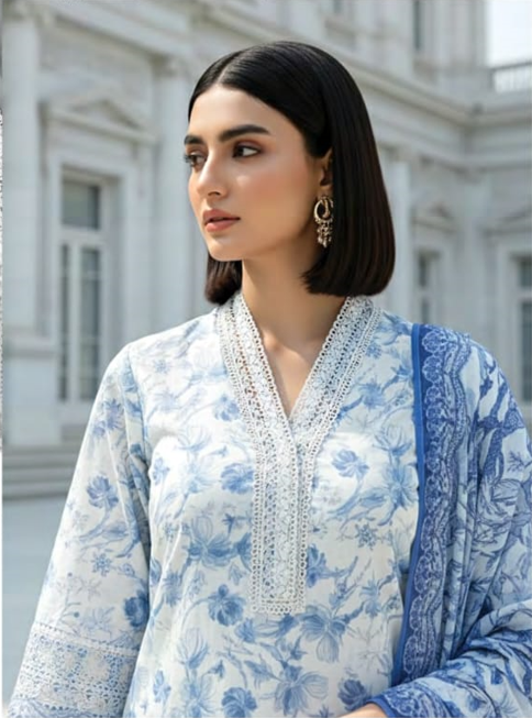 The look is grounded by a coordinating printed lawn dupatta that captures the light with every movement, ensuring a polished presence for formal summer teas and festive luncheons. Matched with dyed white cotton trousers, this 3-piece suite offers a sharp, nature-inspired alternative to traditional summer palettes.