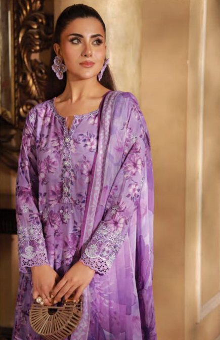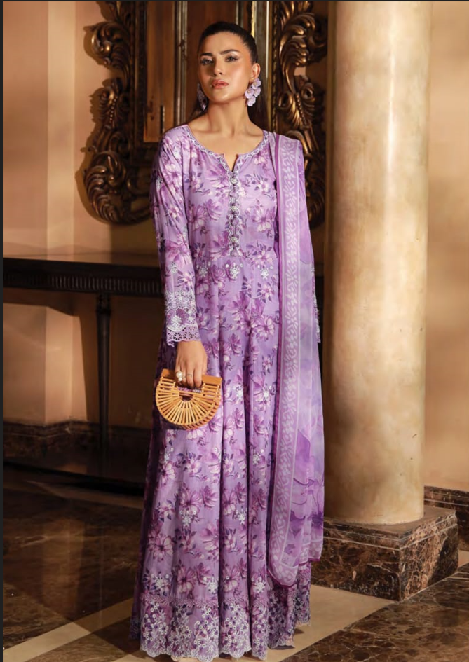 This design is a study in monochromatic beauty and textural depth. The shirt is built on a premium lawn base dyed to a soft Opera Mauve, providing a serene canvas for the oversized lilac and purple floral blooms that trail across the fabric.