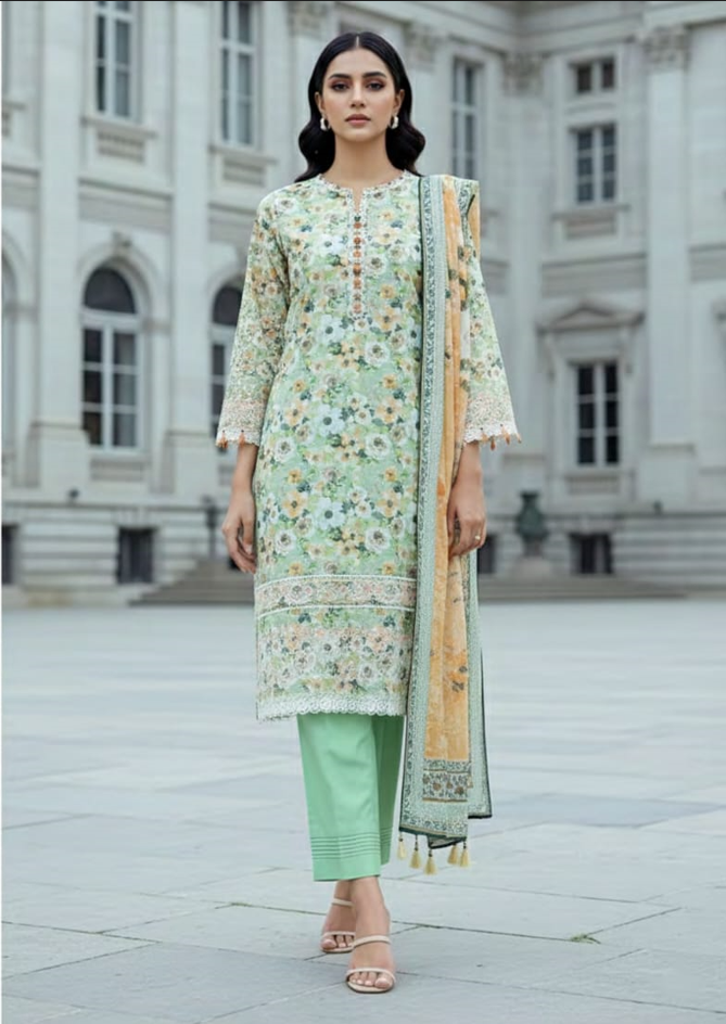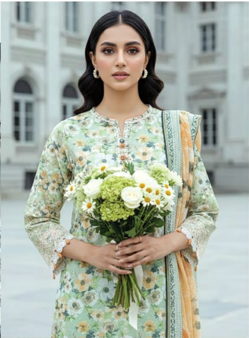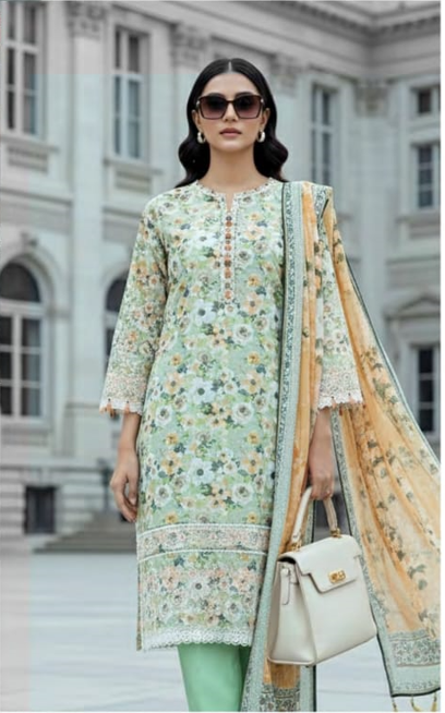 The aesthetic is defined by a vibrant floral printed base, further enriched by dense embroidery on the front panel and sleeves. To allow for custom-tailored precision, the kit includes a separate embroidered border patch that can be used to accentuate the hem or sleeve cuffs. Completing the ensemble is a matching printed lawn dupatta, ensuring a cohesive and polished presence for festive daytime social gatherings.