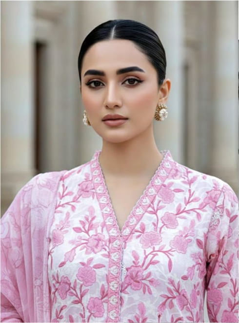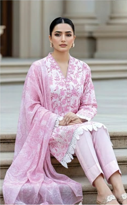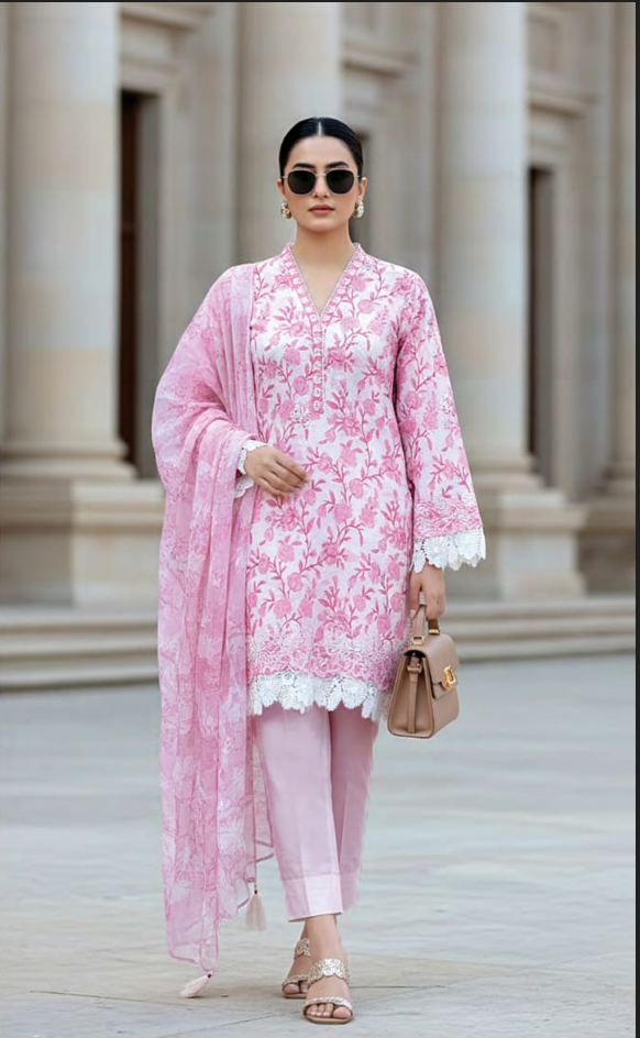Broad, semi-sheer lace-style borders on the sleeves and hem lend a structured, high-fashion feel to the breathable fabric. A tonal chiffon dupatta with scattered monochromatic patterns completes the set, ensuring a polished look that flows effortlessly from morning brunch to afternoon social gatherings. Matched with coordinating straight-cut trousers, this kit is the perfect choice for those who appreciate energetic, feminine aesthetics.