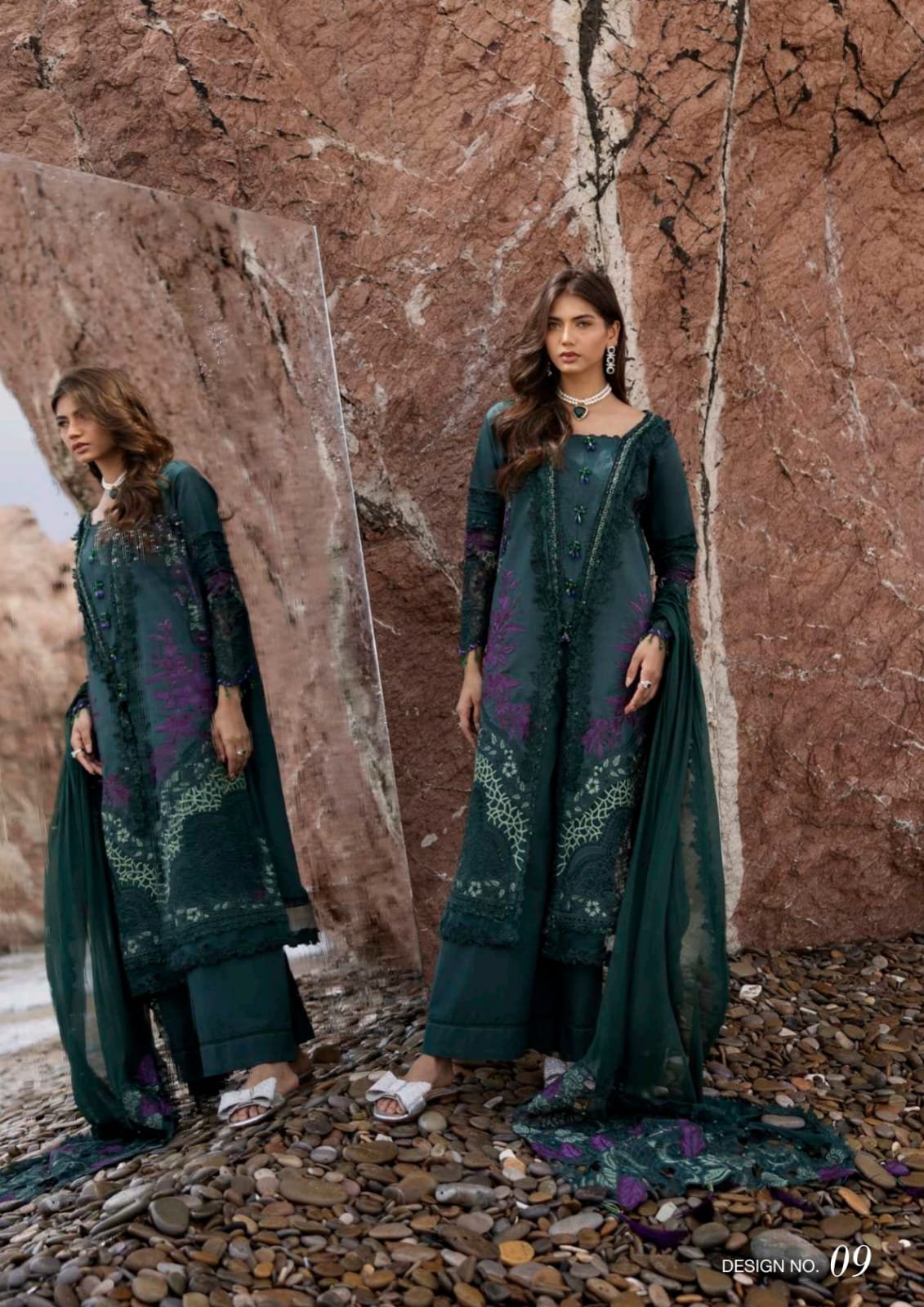 Make a bold statement with Design No. 09 from Alzohaib’s Mahiymaan collection. This deep emerald teal ensemble features a heavily embroidered lawn shirt with vibrant purple accents and a luxurious embroidered net dupatta with scalloped details.