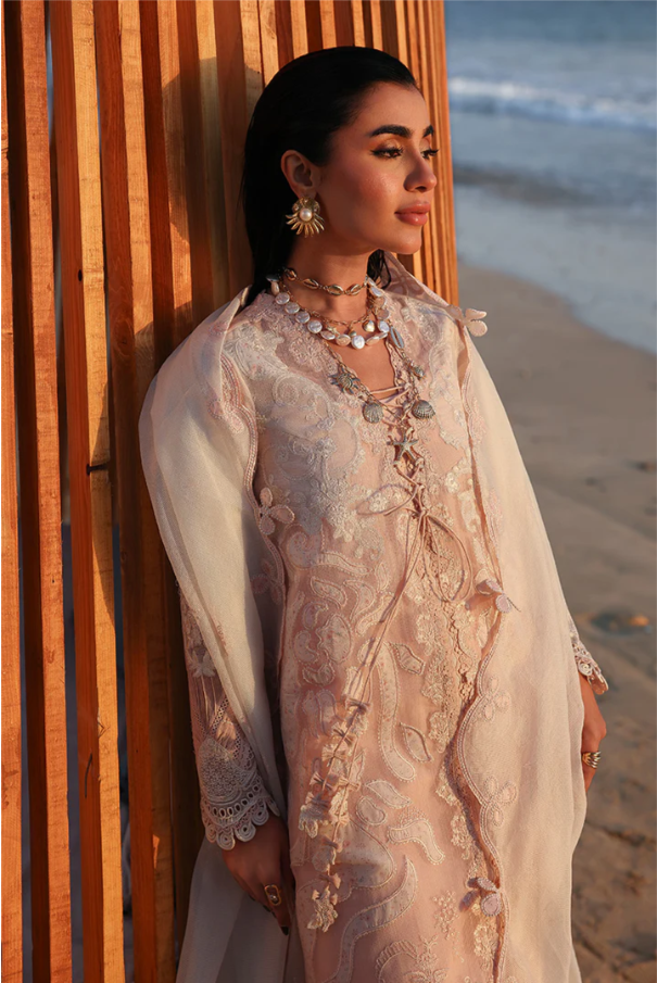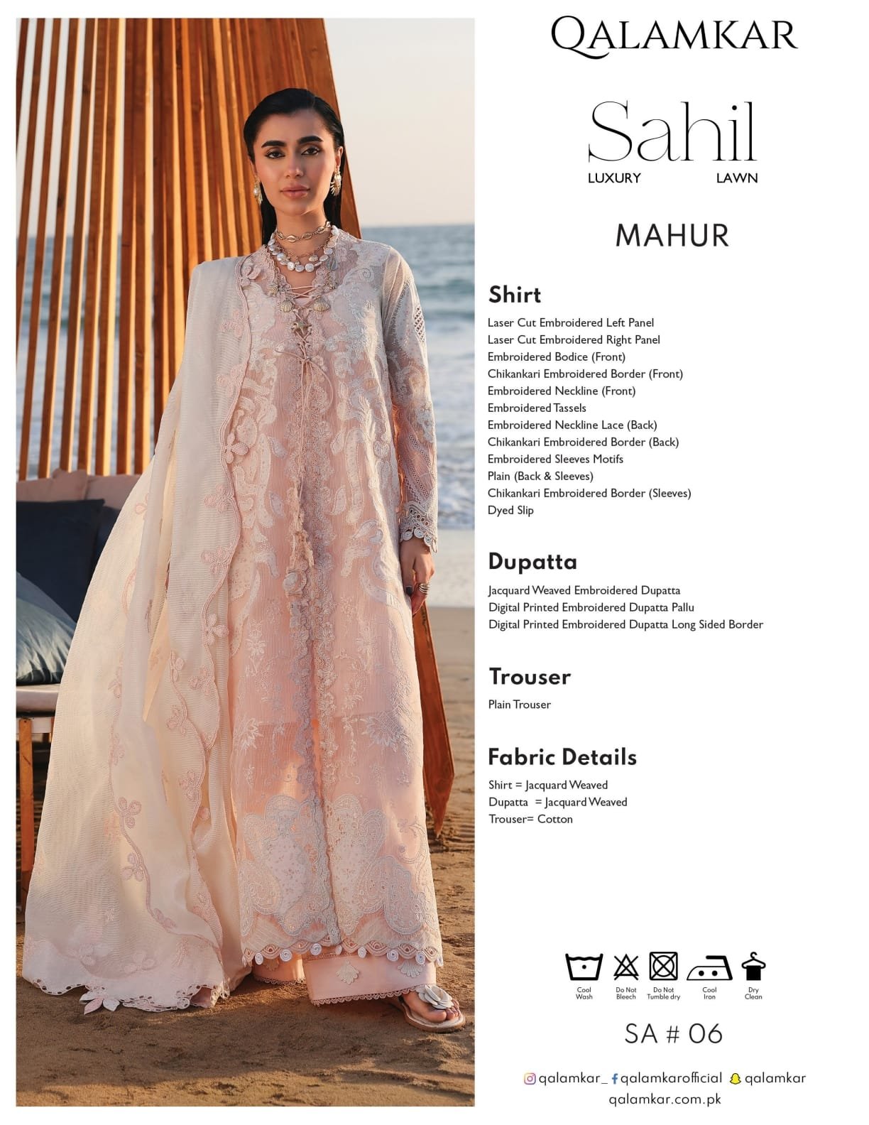 Immerse yourself in luxury with Mahur (SA-06), a highlights of the Qalamkar Sahil Luxury Lawn 2026 series. This 3-piece unstitched suit is a masterclass in tonal peach artistry, blending a unique jacquard weaved base with high-end laser-cut and Chikankari techniques.