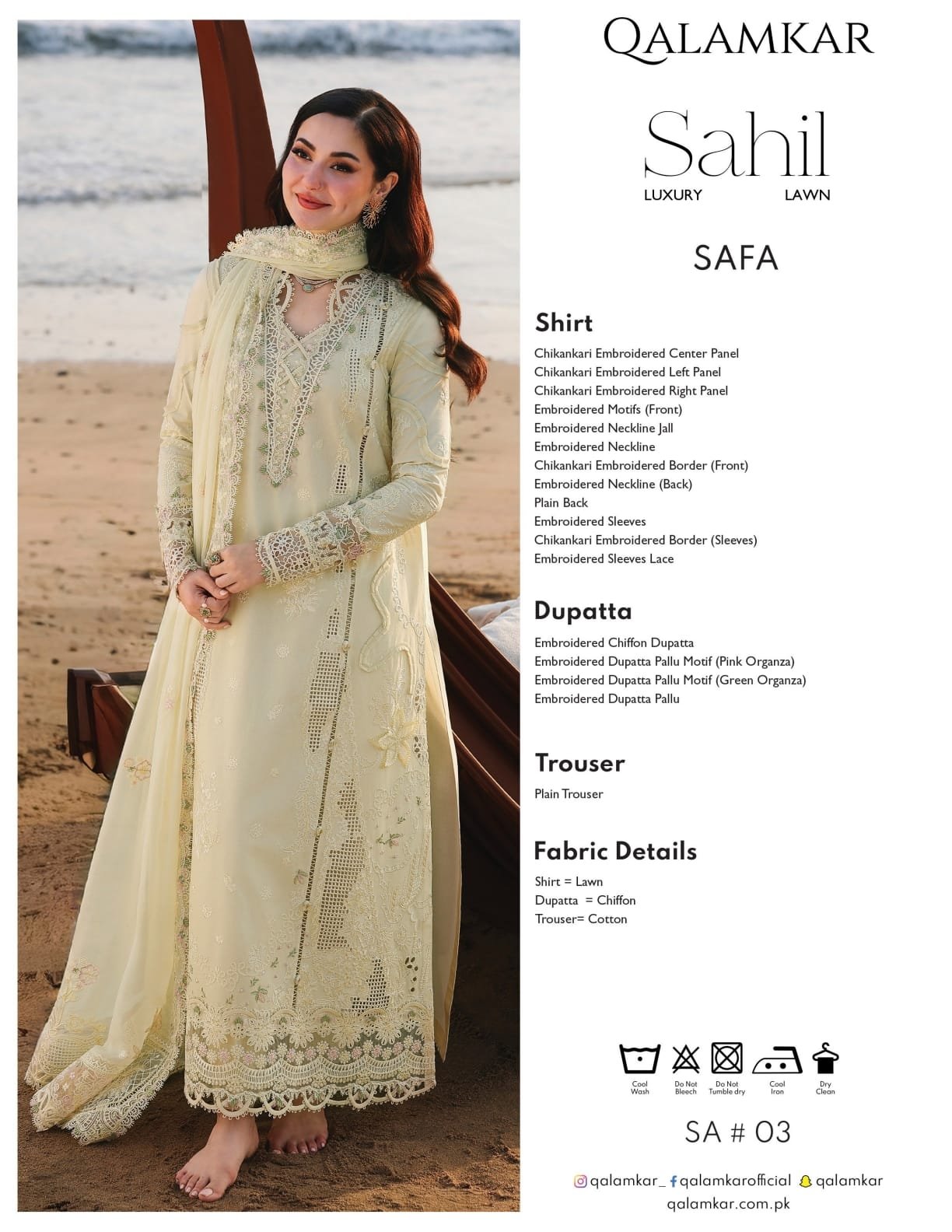 Illuminate your festive wardrobe with Safa (SA-03), a standout piece from the Qalamkar Sahil Luxury Lawn 2026 catalogue. This 3-piece unstitched suit is a masterclass in tonal elegance, combining a refreshing lemon yellow palette with the traditional artistry of Chikankari.