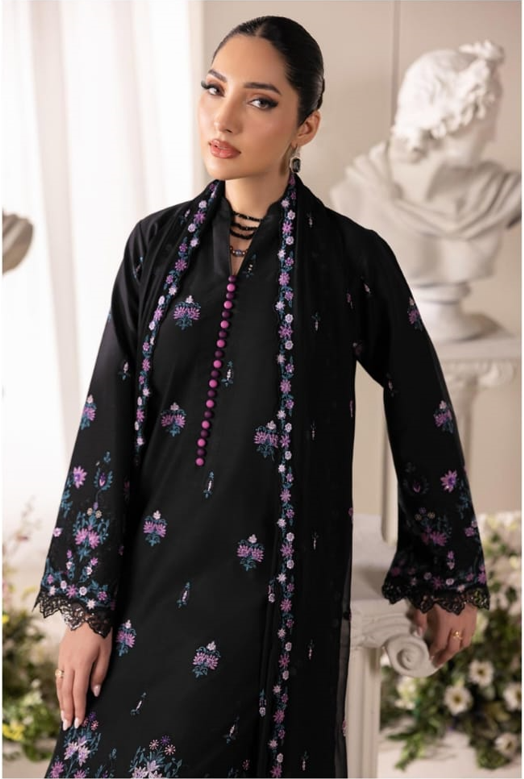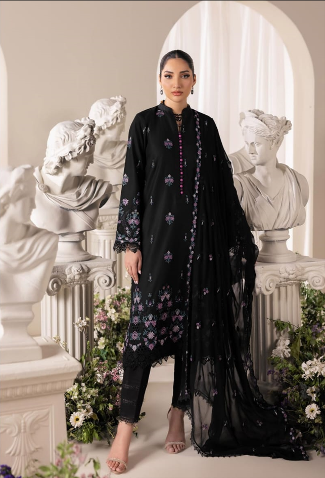 Paired with a lightweight embroidered chiffon dupatta and matching black trousers, Design No. 01 is a versatile staple for formal evenings, offering a sharp, polished look that never goes out of style.