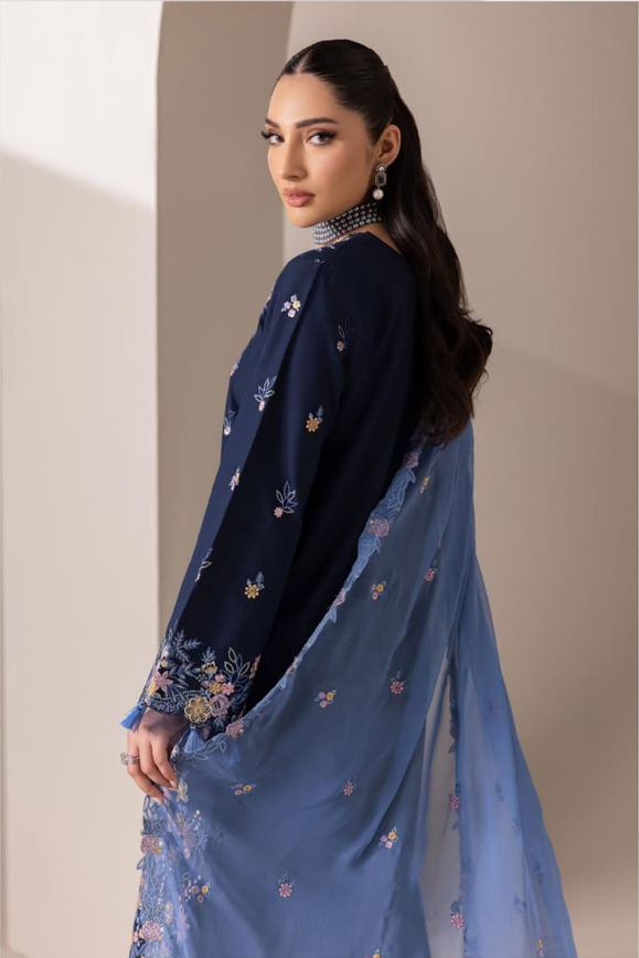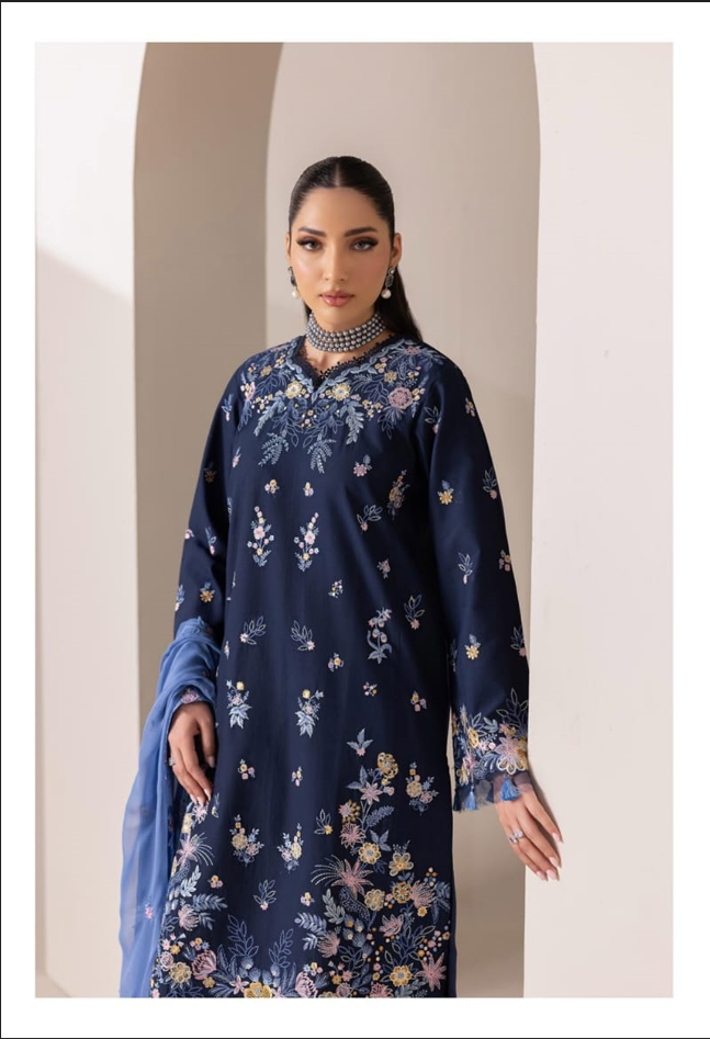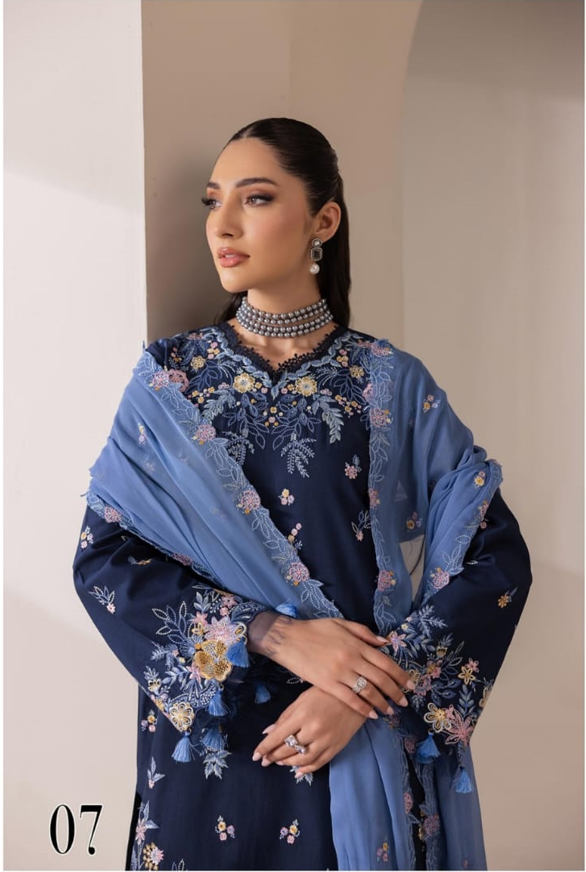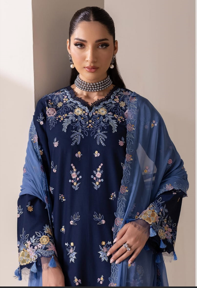 Design No. 07 is a masterclass in high-contrast elegance from the RajBari Premium Edition Lawn 2026 collection. Crafted for festive daytime events and formal evening social gatherings, this 3-piece suit centers on a rich Midnight Navy base that allows the vibrant threadwork to take center stage.