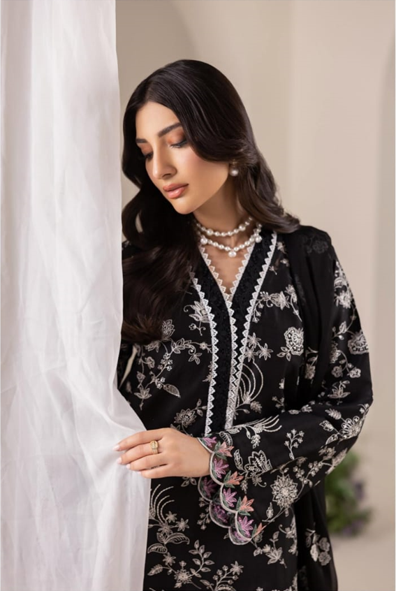 The kameez is tailored from RajBari’s signature Pima Lawn, ensuring a silky-smooth texture and maximum breathability for formal summer gatherings. The front panel is adorned with an all-over ivory floral vine embroidery, creating a striking visual contrast against the black base. The sleeves are further detailed with intricate Schiffli-style borders and scalloped cuffs, offering a tailored, couture-inspired finish.