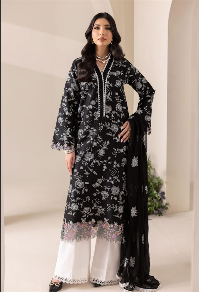 Step into a legacy of refined ethnic style with Design No. 10 from the RajBari Premium Edition Summer Lawn 2026 collection. Designed for the woman who appreciates the power of classic noir, this 3-piece suit masterfully combines deep saturation with the delicate intricacy of ivory threadwork.